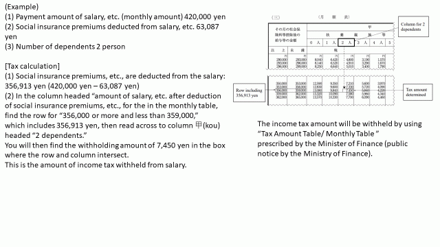 The amount of income tax and special income tax for reconstruction withheld from salary, bonuses, etc. can be determined by using the Tax Amount Table prescribed by the Minister of Finance (public notice by the Ministry of Finance).